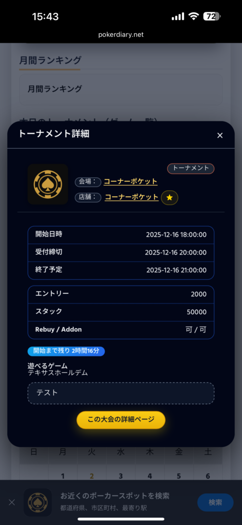 管理画面からトーナメントを投稿すると、店舗ページに「本日のトーナメント」と月間カレンダーが自動で更新されます。